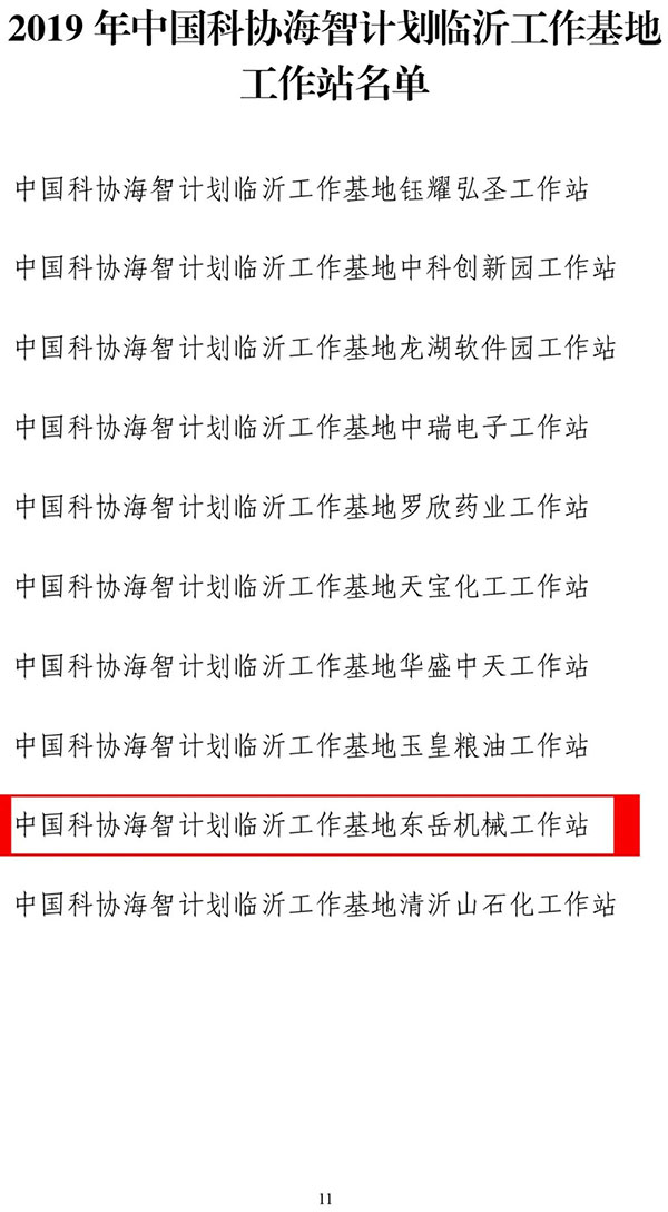 經(jīng)臨沂市科學(xué)技術(shù)協(xié)會批準設(shè)立東岳機械為中國科學(xué)技術(shù)協(xié)會“海外智力為國服務(wù)行動計劃臨沂基地工作站”(簡稱海智計劃工作基地)。