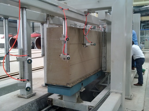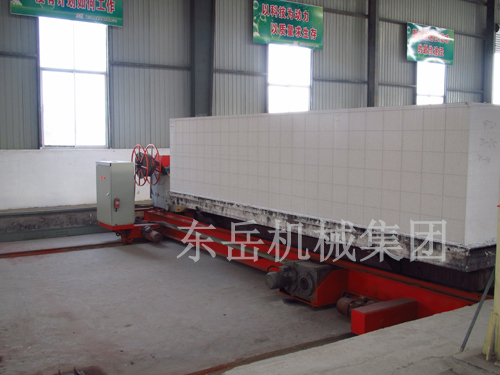澆注后模具用輸送鏈推入初養(yǎng)室進(jìn)行發(fā)氣初凝,室溫為50~70℃,初養(yǎng)時(shí)間為1.5-2小時(shí)(根據(jù)地理有利條件,可免去此工藝),初養(yǎng)后用負(fù)壓吊具將??蚣芭黧w一同吊到預(yù)先放好釜底板的切割臺(tái)上.脫去模框.切割機(jī)即對(duì)坯體進(jìn)行橫切、縱切、銑面包頭,模框吊回到運(yùn)模車上人工清理和除油,然后吊到模車上組模進(jìn)行下一次澆注,切好后的坯體連同釜底板用天車吊到釜車上碼放兩層,層間有四個(gè)支撐,若干個(gè)釜車編為一組。 加氣塊切割機(jī)